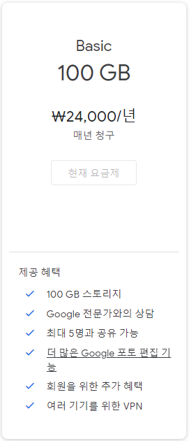 참고로, Basic 플랜의 경우 연 24,000원 이면 사용 가능하고 기본 스토리지에 추가 스토리지를 더해서 총 100GB 스토리지를 사용 가능하게 해 줍니다.