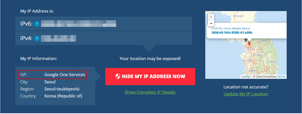 외국의 IP 확인 사이트 통해서 확인해 보면 VPN 을 사용해도 아래와 같이 한국에서 서비스 되고 있음이 표시 됩니다.