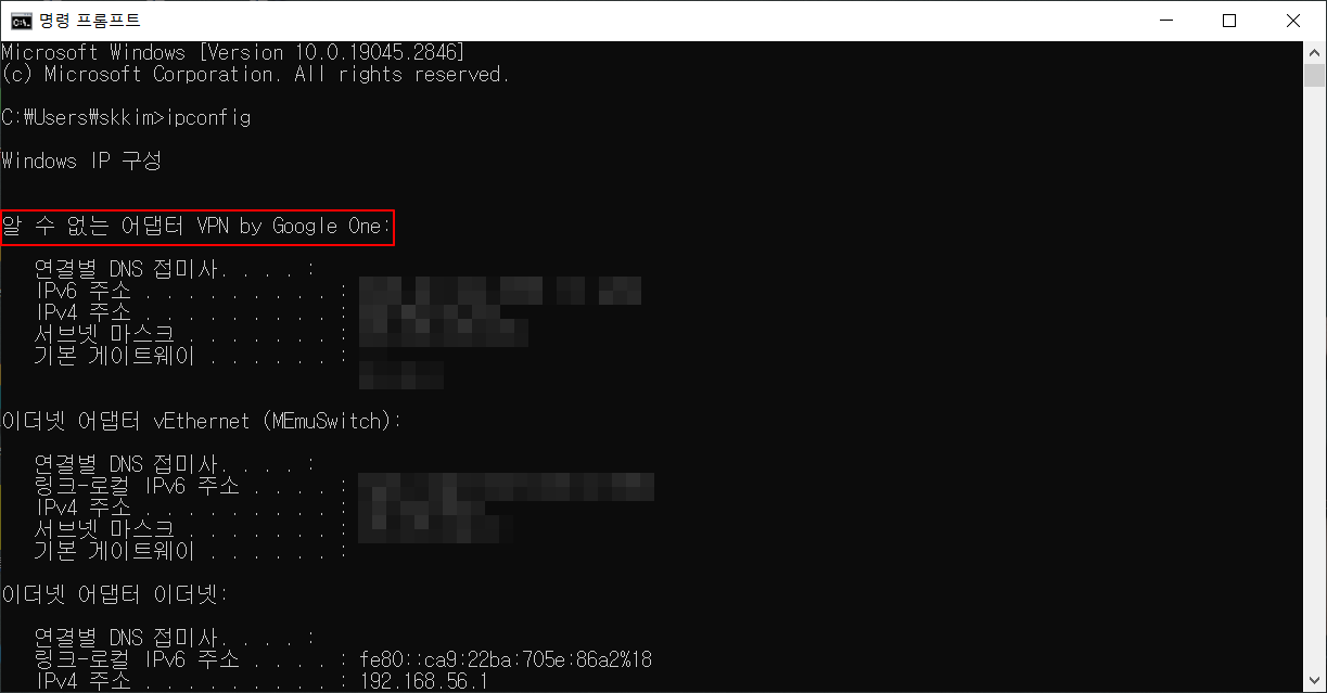 참고로 CMD 창에서 ipconfig 명령어로 확인해 보시면 아래와 같이 나오게 됩니다.