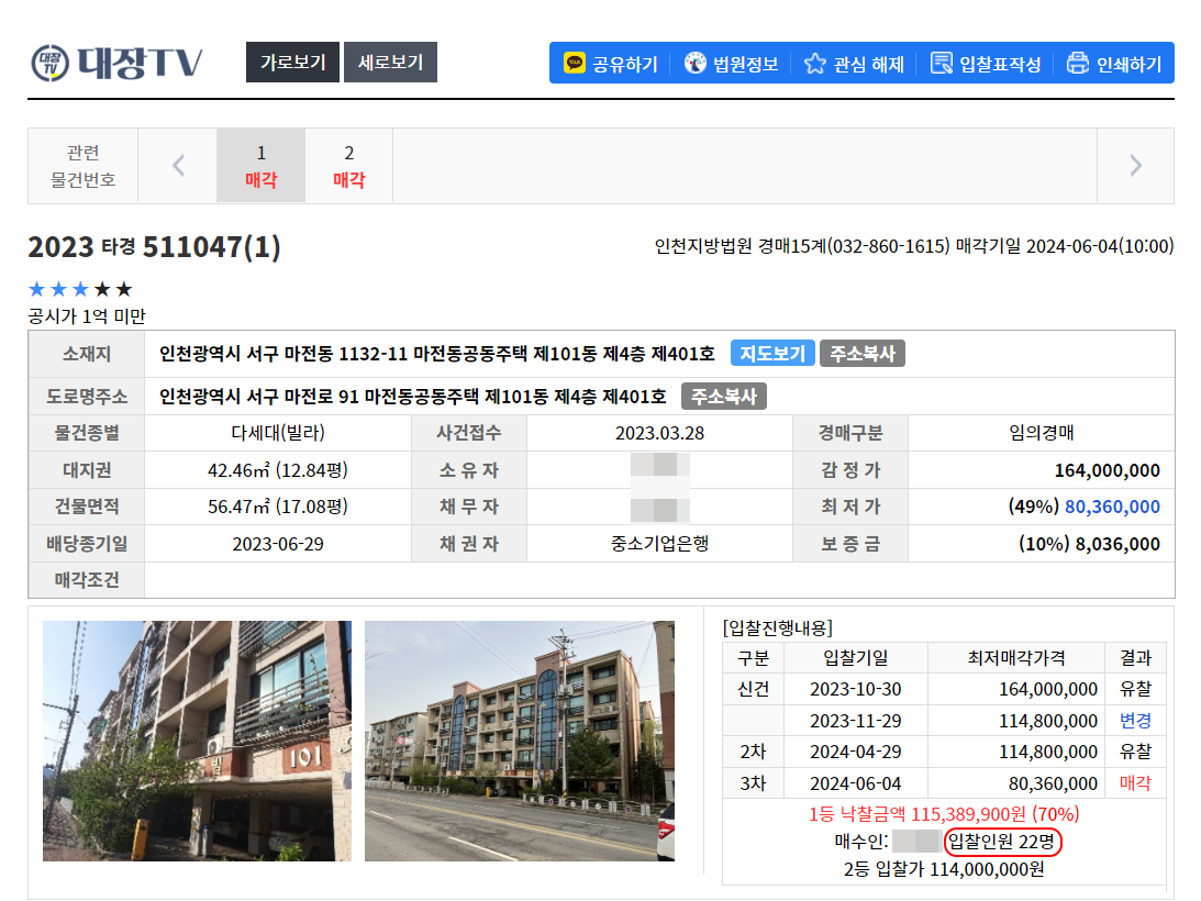 근데... 입찰자는 대부분 저처럼 1번과 2번 물건 모두 응찰 들어온 분들이었습니다.