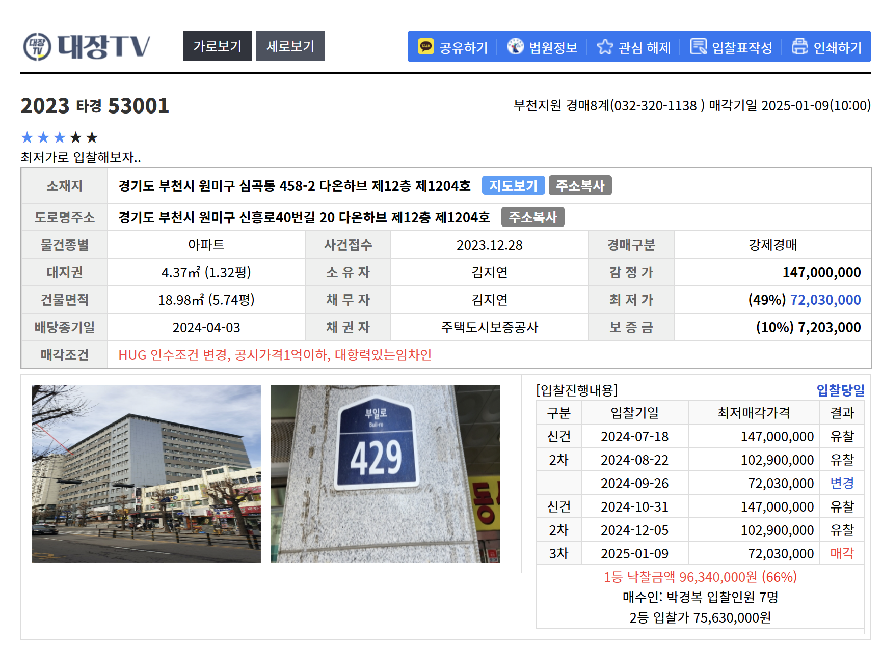 - 낙찰자 본인 입찰이 아닌 대리인 입찰인 것으로 보아 경매 브로커가 아닐까 하는 의심을 살짝 함.