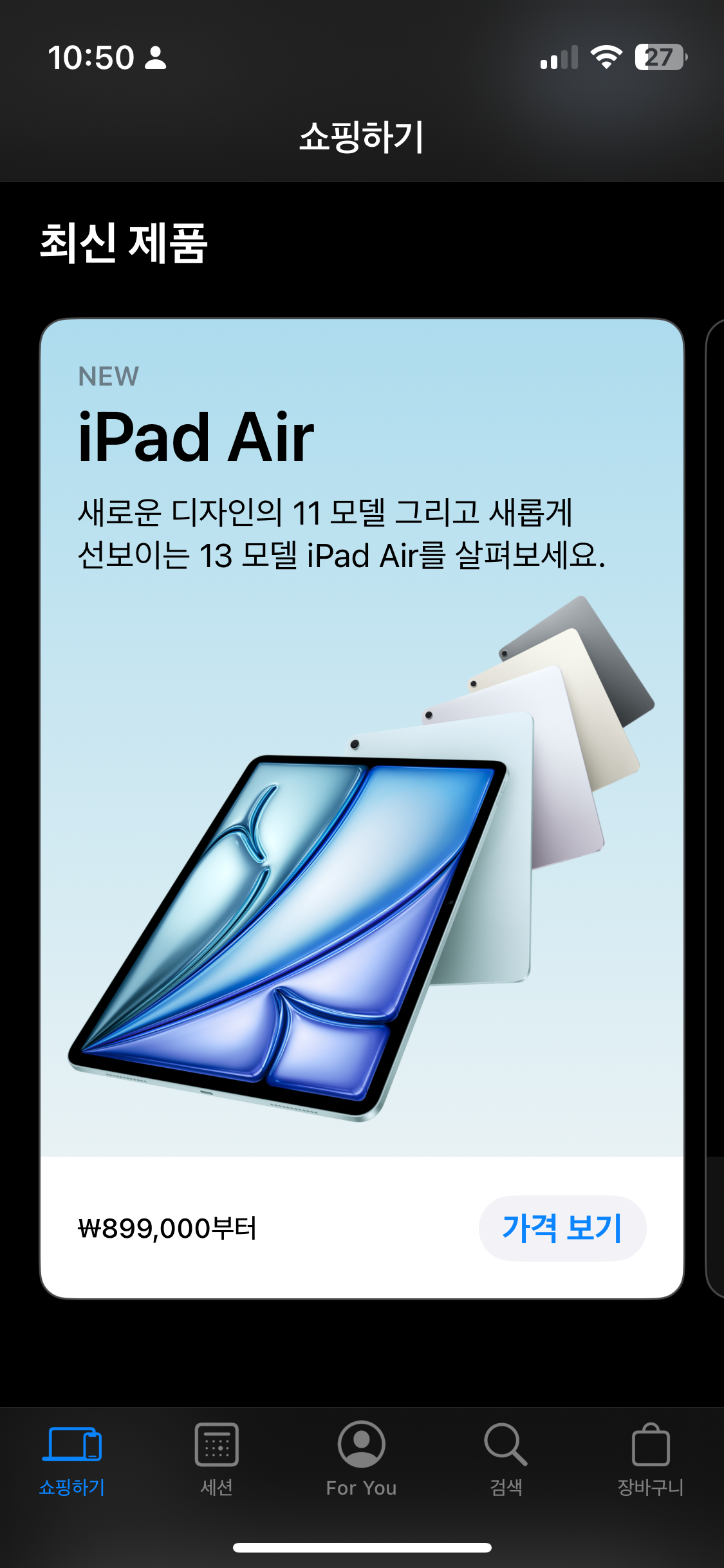 iPad Air - 11gud 899,000원 부터, 13형 1,199,000원 부터. 2테라 셀룰러 모델은 2,179,000원 이며 Pro 모델 대비 약 55% 의 가격으로 구매가 가능합니다.