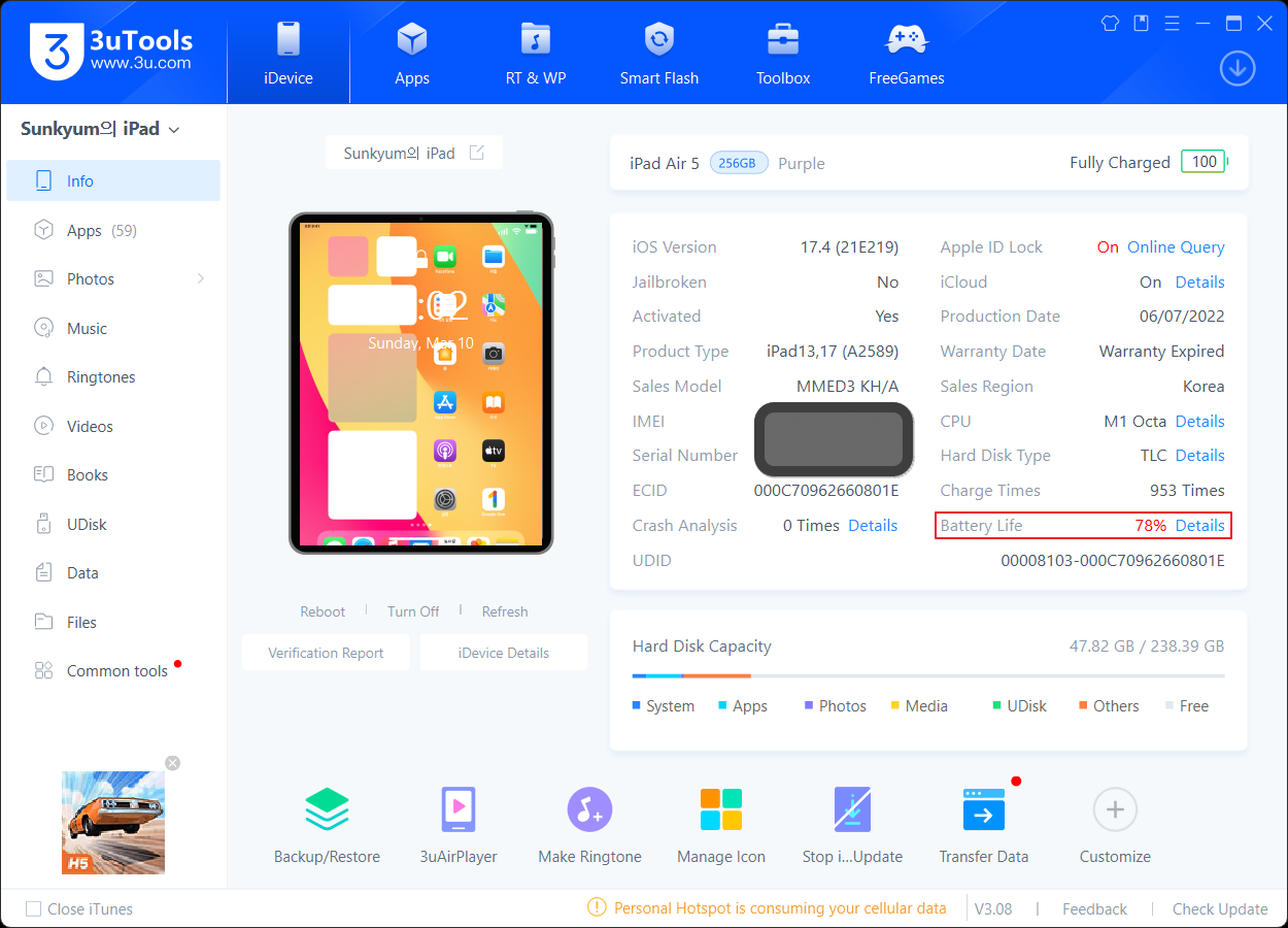 툴의 이름은 3uTools 라고... 그냥 다운받고 설치하고 노트북과 아이패드를 연결하면 정보를 보여 줍니다...