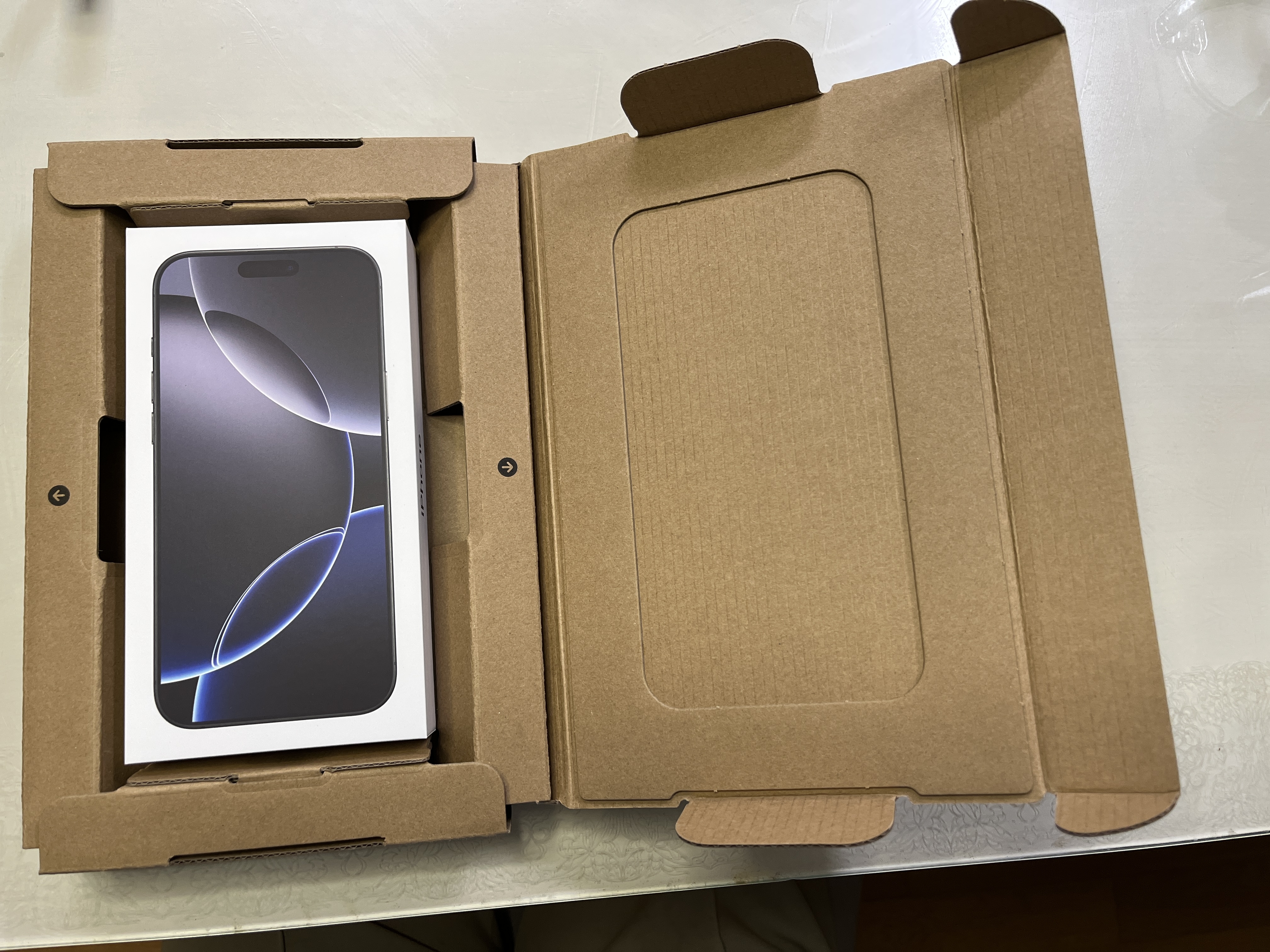 딱 맞는 사이즈의 택배 박스 안에 딱 맞게 아이폰 박스가 들어 있습니다.