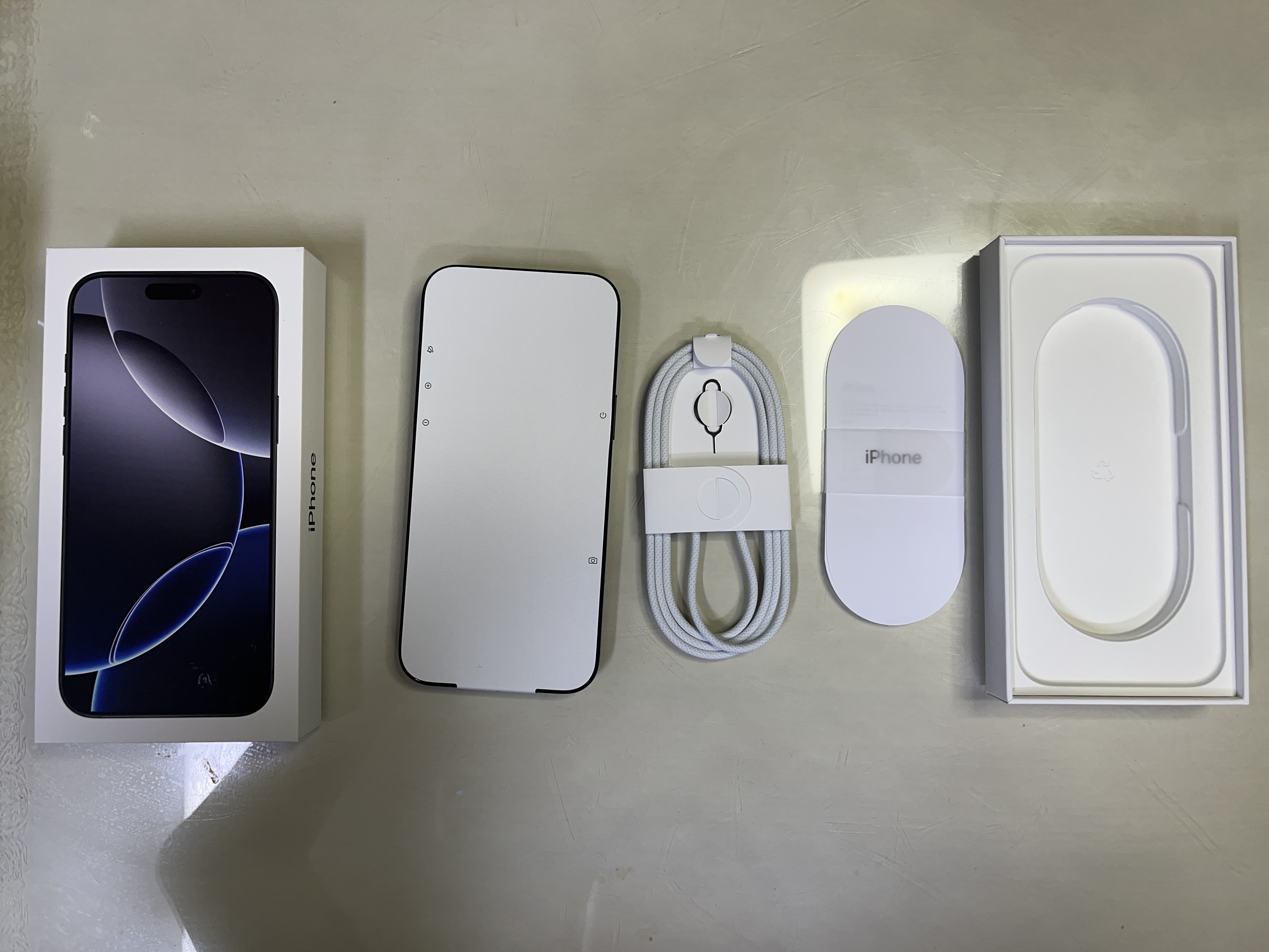 구성품은 아이폰16프로맥스 본체, 유심 리무버, C타입 충전 케이블, 간단설명서(?) 입니다.