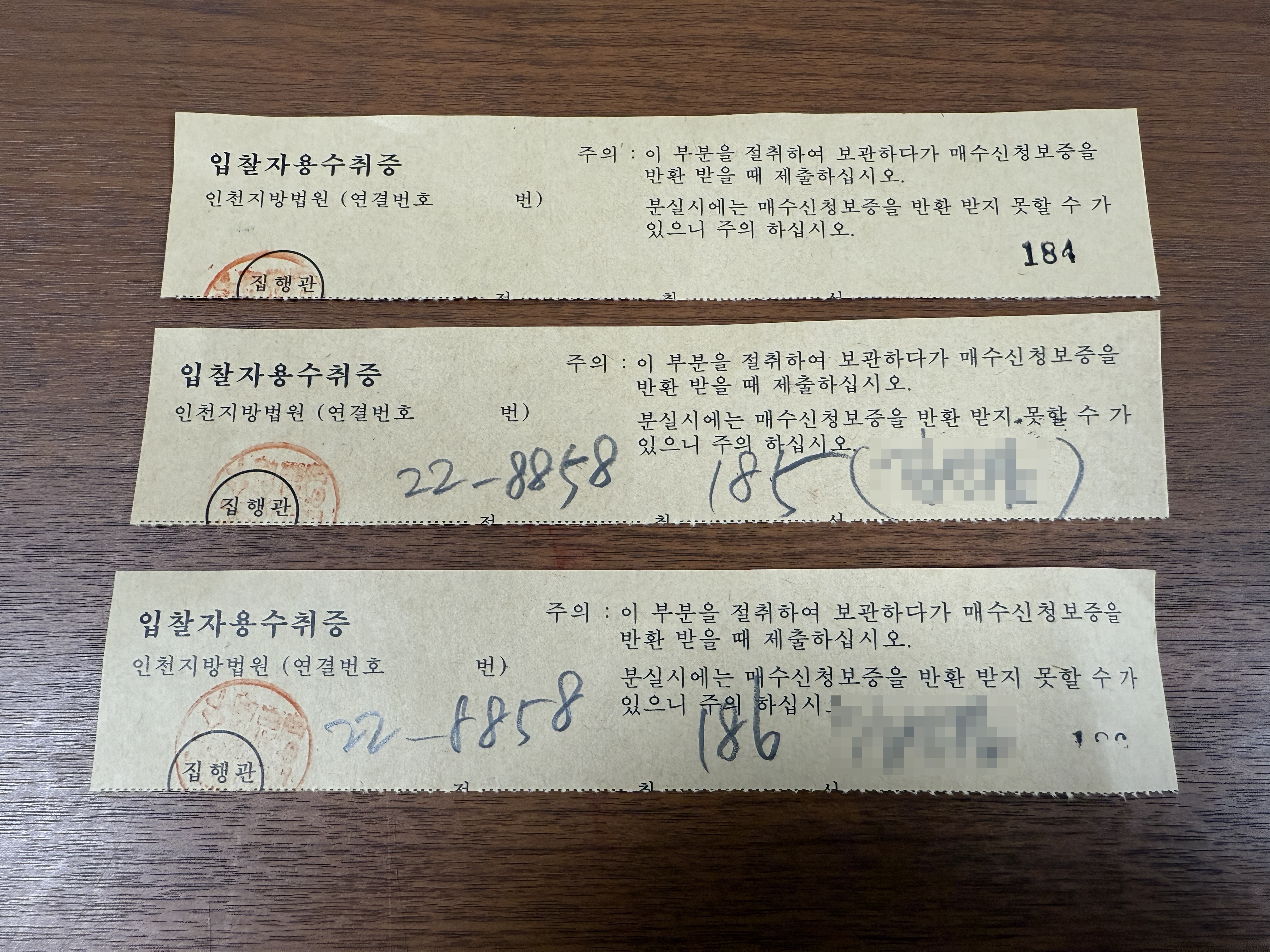 입찰을 하고 나서 수취증을 받아보니, 3개의 수취증 중에서 1개만 번호가 뚜렷히 보이고 나머지는 번호가 안보이더군요.