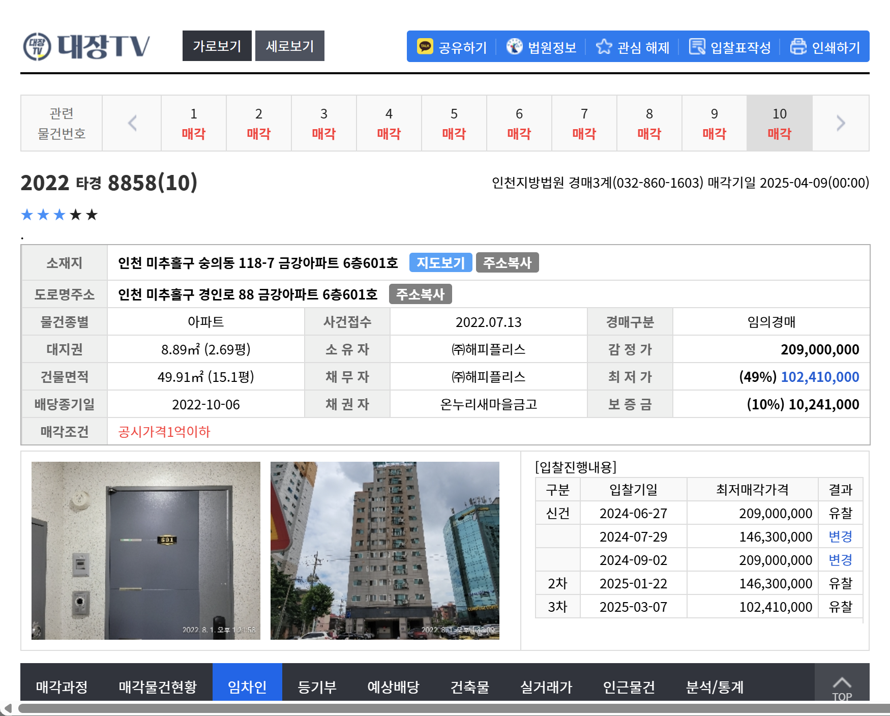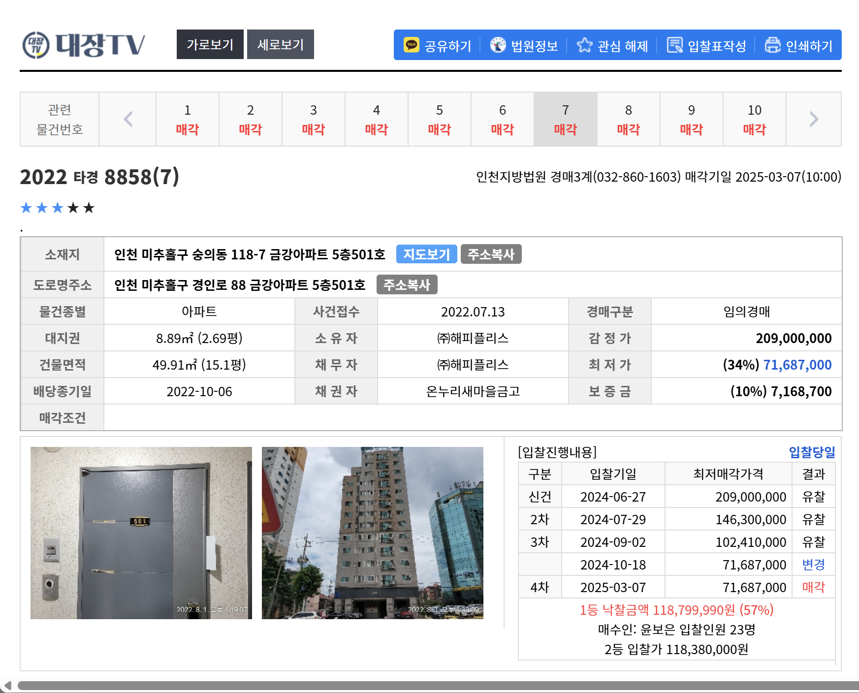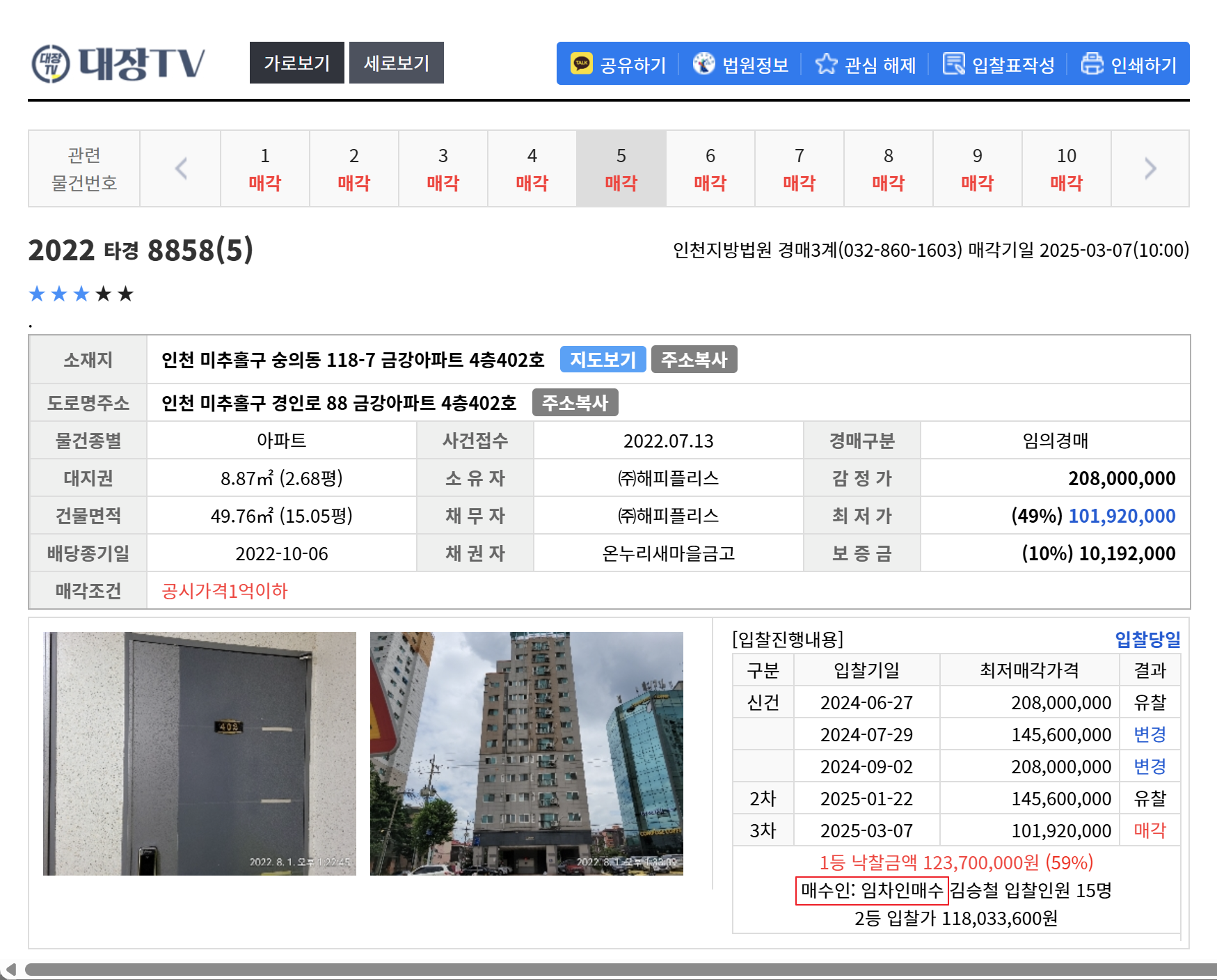위 물건들은 동일 사건번호에 물건번호 5, 7, 10번 물건 입니다.