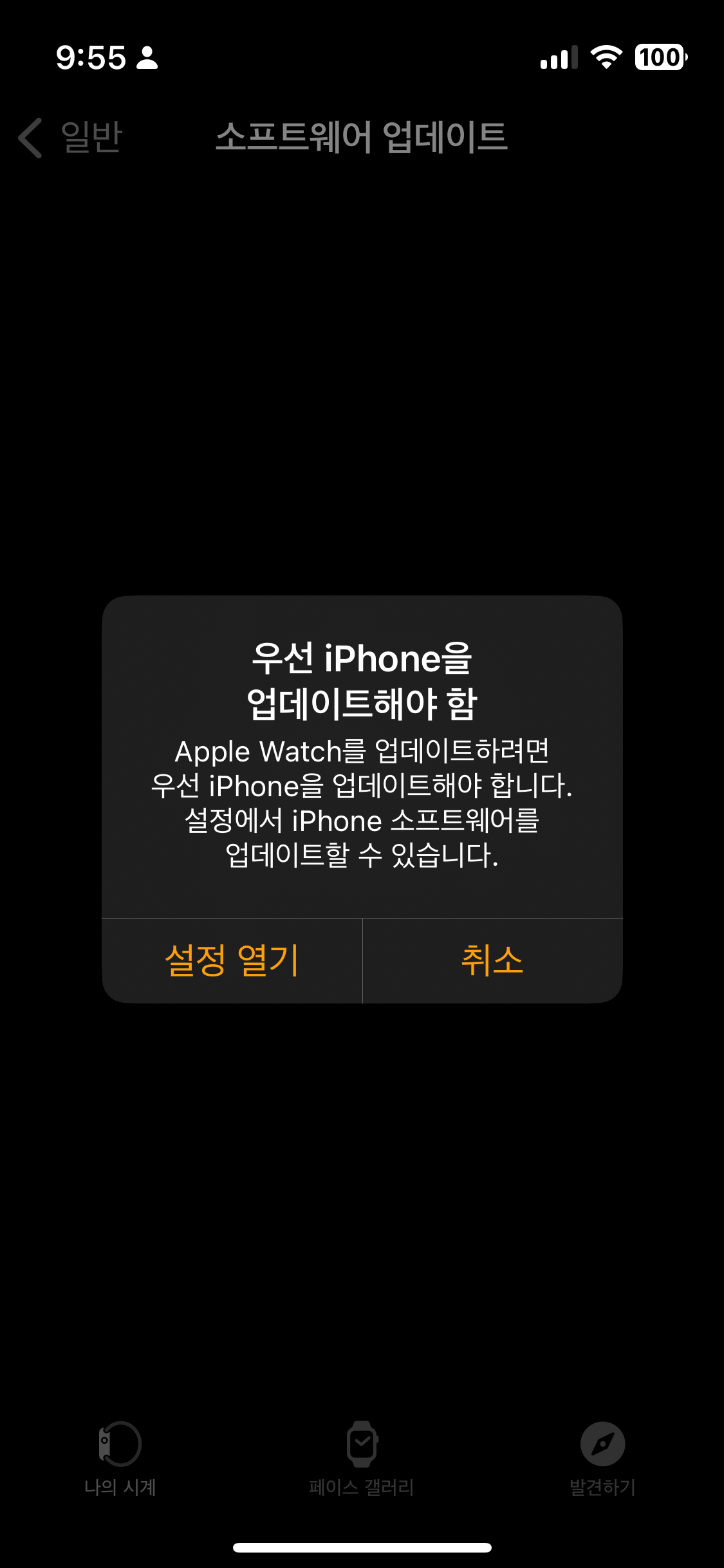 이전 버전 WatchOS 업데이트 시에는 보여지지 않았던 문구로, 이번 버전인 10.4 버전은 아이폰이 17.4 버전 이상의 OS 가 설치되어 있어야만 설치가 되는 것으로 확인됩니다.